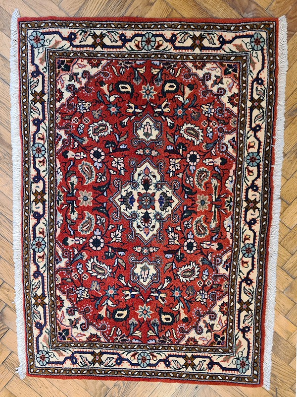 Hamadan ist eine der ältesten Städte der Welt und seit vielen Jahrhunderten ein wichtiges Handels- und Verwaltungszentrum des Iran. Im 6. Jahrhundert v. Chr. war unter dem Namen Ekbatana die Hauptstadt des Mederkönigreichs und später die Sommerresidenz der persischen Achämeniden-Dynastie. Die Stadt liegt auf einem ausgedehnten Plateau in 1.800 Metern Höhe am Fuße des Berges Alvand, daher ist das Klima dort von milden Sommern und kalten Wintern geprägt. Aufgrund ihrer strategisch wichtigen Lage zwischen dem alten Persien und Mesopotamien war die Stadt oft das Ziel verschiedener Armeen. Es wurde bereits von Alexander dem Großen erobert und später im 11. Jahrhundert besetzten die Seldschuken die gesamte Region Hamadan und das benachbarte Aserbaidschan. Obwohl das gesamte Gebiet vom kulturellen Einfluss der turk-altaischen Völker geprägt war, wird in Hamadan auch heute noch die persische Sprache (Farsi) gesprochen, im Gegensatz zum umliegenden Land, wo der türkische Dialekt die Sprache dominiert. Teppiche aus mehr als 600 Dörfern westlich und nördlich von Hamedan warten auf dem Hamedan-Basar auf Käufer. Die Bevölkerung dieser Dörfer besteht auch aus vielen Kurden, über die auch Teppiche aus Bidjar und Sanandaj ihren Weg auf die Basare finden, was zu Verwirrung bei der Bestimmung der Herkunft der Teppiche führt. Vor einigen Jahrzehnten hatte jedes Dorf eine unverwechselbare Kombination aus Mustern und Farben für seine Teppiche, sodass die Händler der Hamadan-Basare einen echten Hamadan-Teppich schnell erkennen konnten. Charakteristisch für Hamadan-Teppiche ist, dass sie zwischen zwei Knotenreihen einen querverlaufenden Baumwollfaden aufweisen, die Knoten symmetrisch sind und die Grundstruktur, mit Ausnahme einiger sehr alter Teppiche, immer aus Baumwolle besteht. Auch die nomadischen Völker der Belutschen und Bachtiaren verwenden diese Produktionstechnik, unterscheiden sich jedoch von ihnen in der Art der Wolle. Die wichtigsten Teppichknüpfgebiete sind Dergazin, Mehriban, Khamseh und Borchalou. In einem einzigen Gebiet können sich über 40 Dörfer befinden. Im 16. Jahrhundert schenkte der Safawiden-Schah Tahmasp dem osmanischen Sultan Süleyman dem Prächtigen einen Teppich aus der Gegend von Dergazin. Dies bedeutet, dass sie neben traditionellen Teppichen auch wussten, wie man feinere Teppiche für die Höfe herstellt.