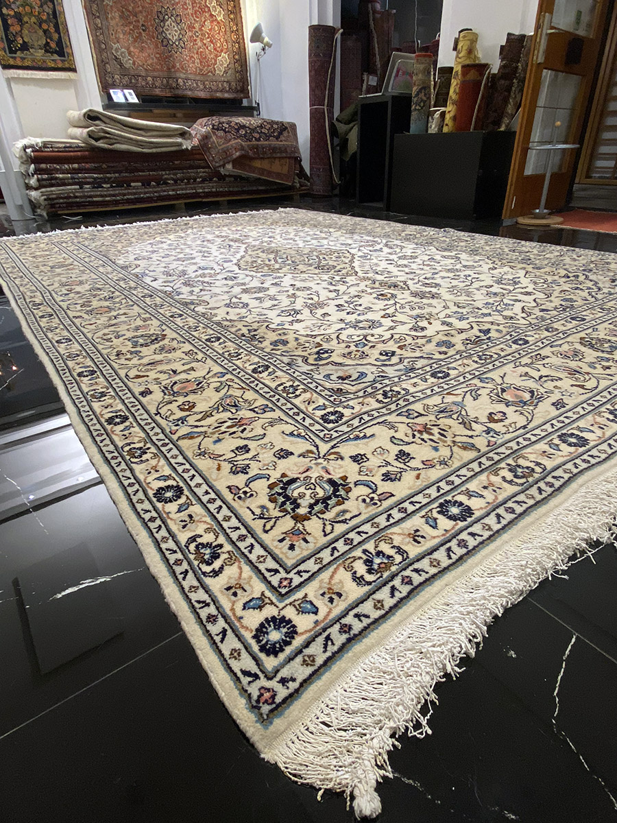 Die Stadt Kaschan liegt 250 km südlich von Teheran in einer großen Oase an der Wüste Kavir in Zentraliran. Dieses Gebiet war bereits in prähistorischer Zeit besiedelt und spielte sowohl während der Sassaniden-Dynastie als auch später nach der Ankunft der islamischen Kultur eine bedeutende Rolle. Kaschan-Teppiche werden aus feinster Kork-Wolle (vom Nacken der Lämmer) gefertigt und unter Verwendung der asymmetrischen Knüpftechnik (persischer Knoten) hergestellt, wodurch die Teppiche außerordentlich fein und zugleich sehr strapazierfähig sind. Charakteristisch sind vielfältige florale Muster sowie Arabesken, Palmetten und Blattmotive – ein Design, das ideal für klassische Raumgestaltung ist. Sie repräsentieren das Erbe der goldenen Ära der Teppichherstellung im Iran (16. und 17. Jahrhundert), als Schah Abbas ein großer Förderer dieser Kunst war.