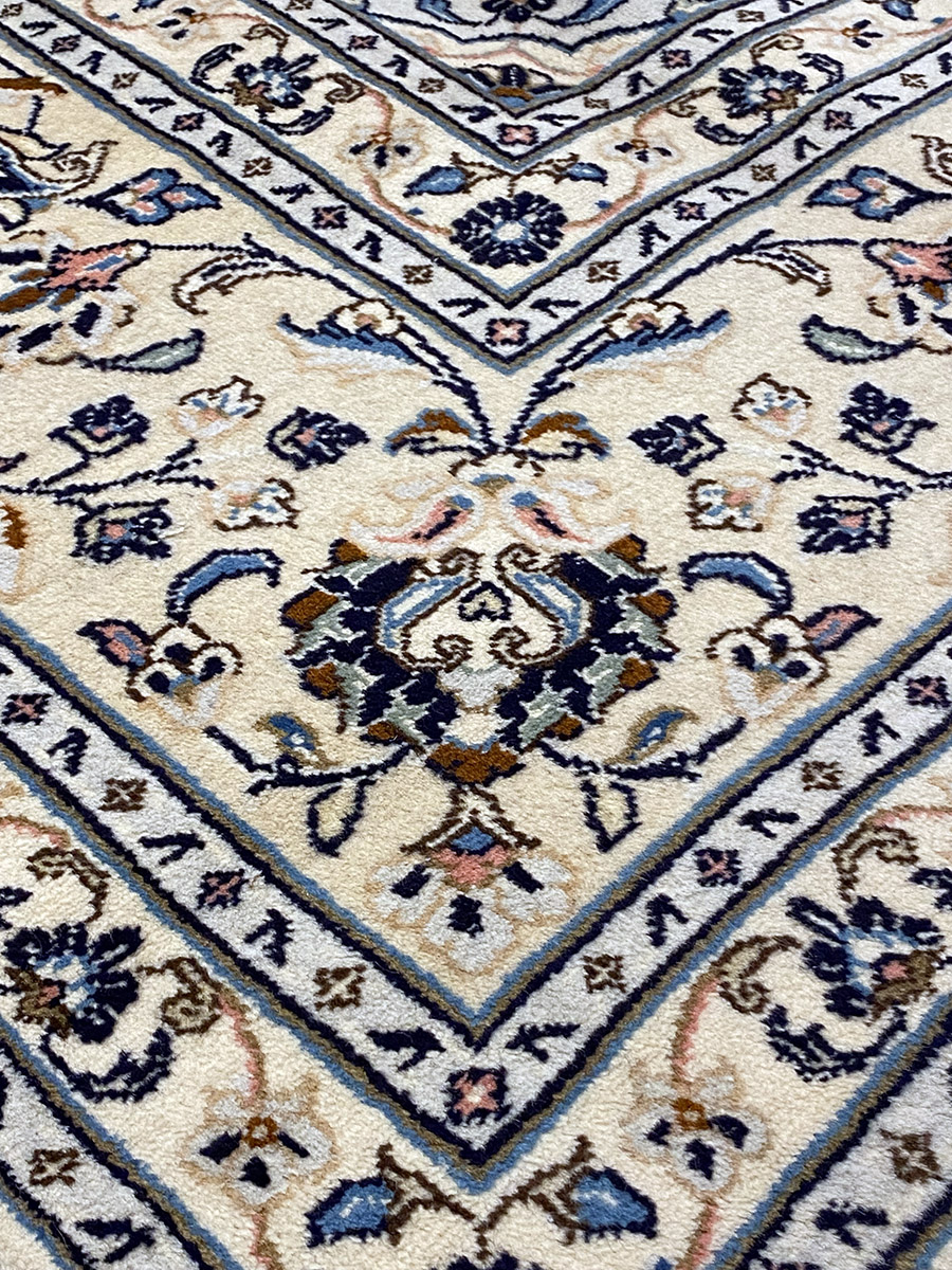 Die Ästhetik des Kaschan-Teppichs basiert auf Ausgewogenheit und Harmonie – erkennbar an dem zentralen Medaillon mit üppigen floralen Ornamenten, die sich über die gesamte Fläche in Form von Vignetten, Blättern und Arabesken ausbreiten. Die Muster sind äußerst detailliert und mit höchster Präzision gefertigt, was dem Teppich ein Gefühl von Zartheit und Vornehmheit verleiht.