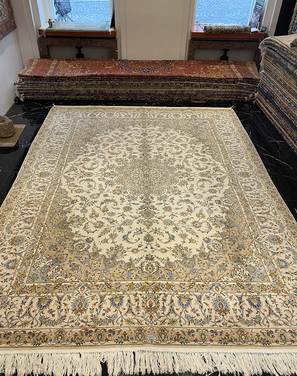 Dieser Teppich ist ein charakteristischer Vertreter der klassischen Kaschan-Knüpfschule, der sich durch ein zentral platziertes Medaillon, reich verzweigte florale Muster und eine harmonische Farbpalette auszeichnet, die die gesamte Komposition durchzieht.