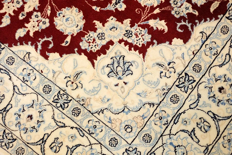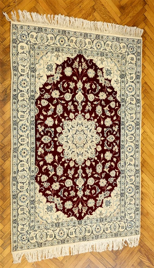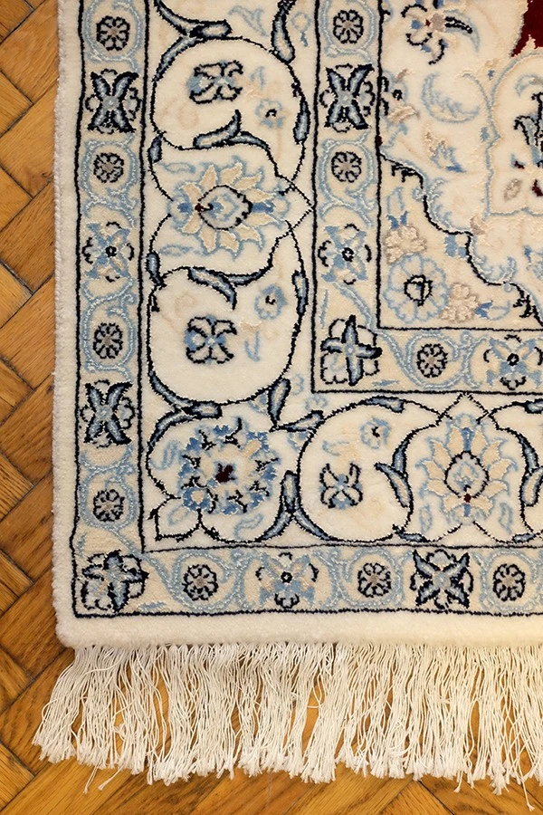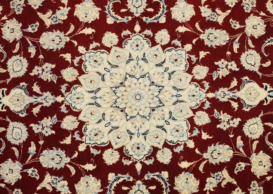 Ein sehr dicht geknüpfter, schneeweißer Nain mit karminroter Basis, auf der ein Medaillon in voller Blüte schwebt. Lotusblumen und Lilien sind kunstvoll ineinander verschlungen, Seidenbordüren unterstreichen ihre Schönheit durch ihre Brillanz. Nain-Teppiche gelten als einige der schönsten, kunstvollsten und bezauberndsten Perserteppiche.