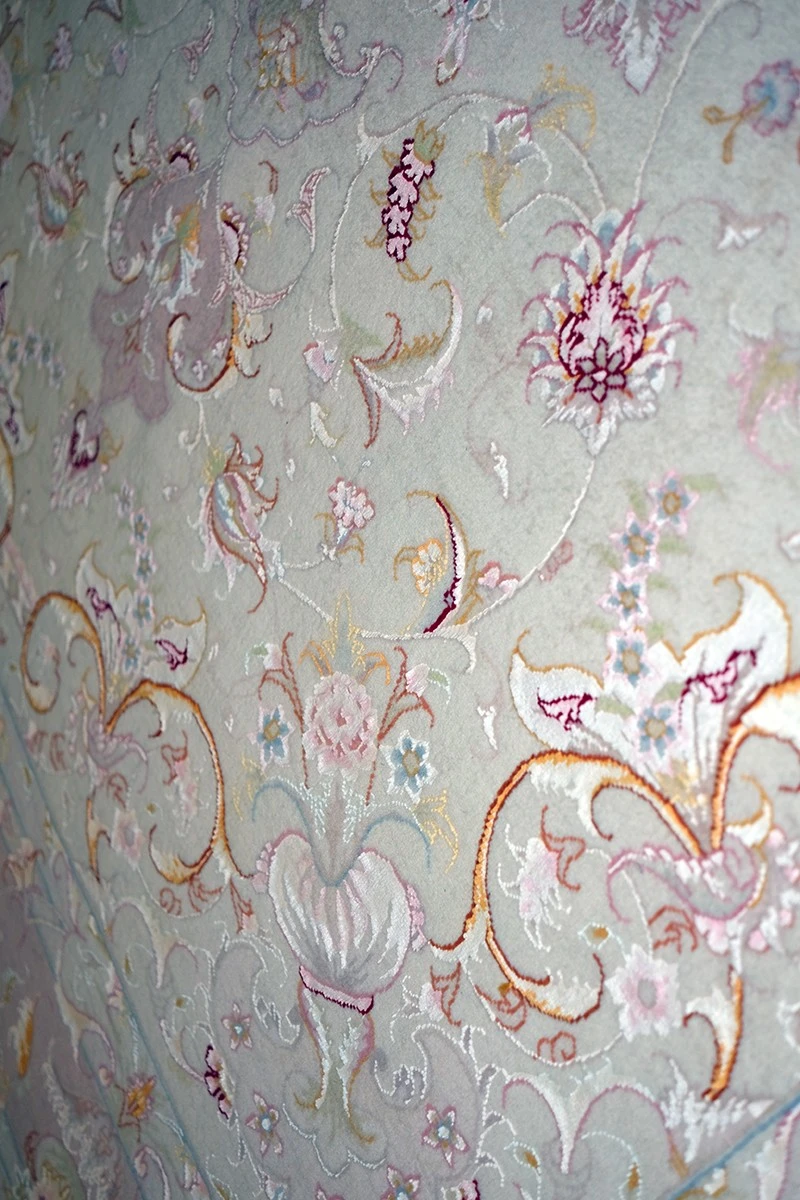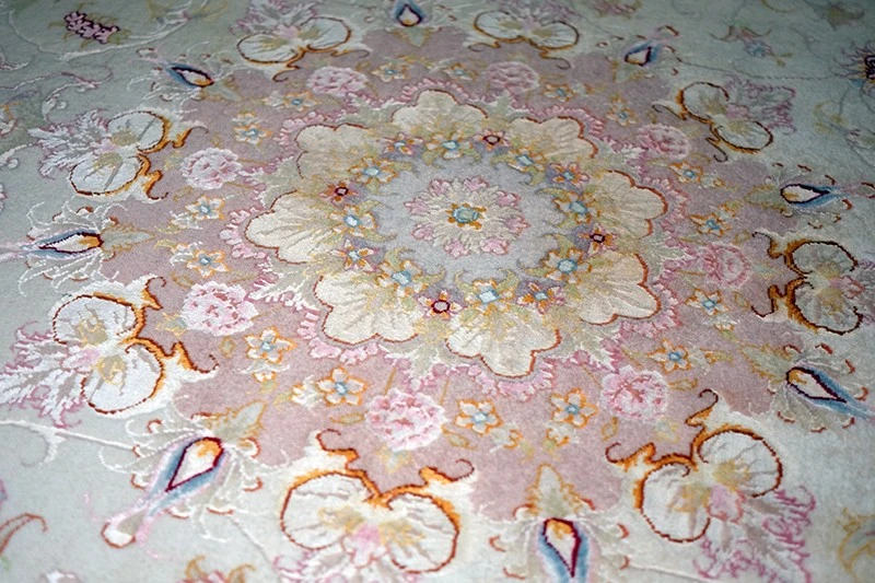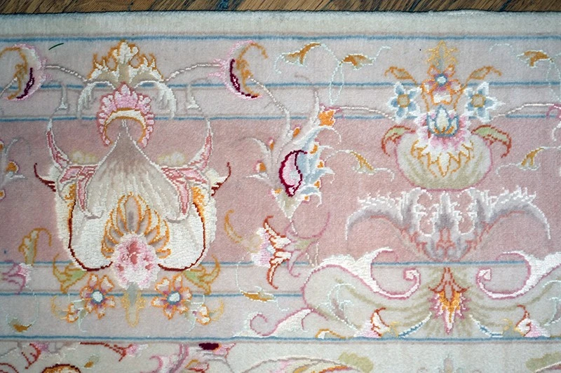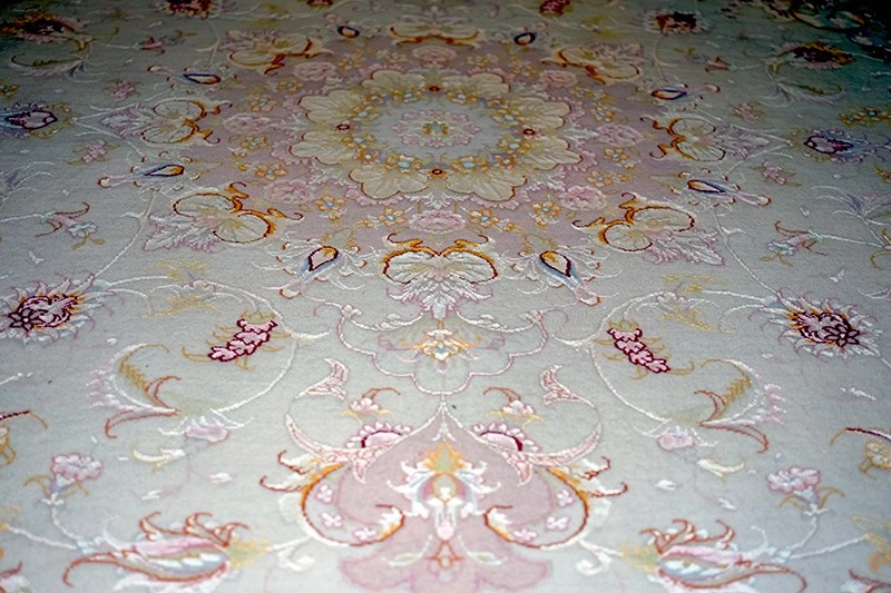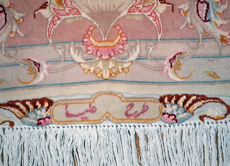 Hochwertige Teppiche aus Täbris haben kurze und starke Knoten. Ein charakteristisches Muster ist ein Motiv mit einem zentralen Medaillon (persisch: toranj), umgeben von Arabesken, Ranken oder Zypressen ( Boteh-Motiv ). Ein weiteres bekanntes Motiv ist das Motiv der vier Jahreszeiten. Manchmal sind auch die größten persischen Dichter wie Sadi, Hafez, Firduzi und Omar Khayam in den Teppich eingewebt.