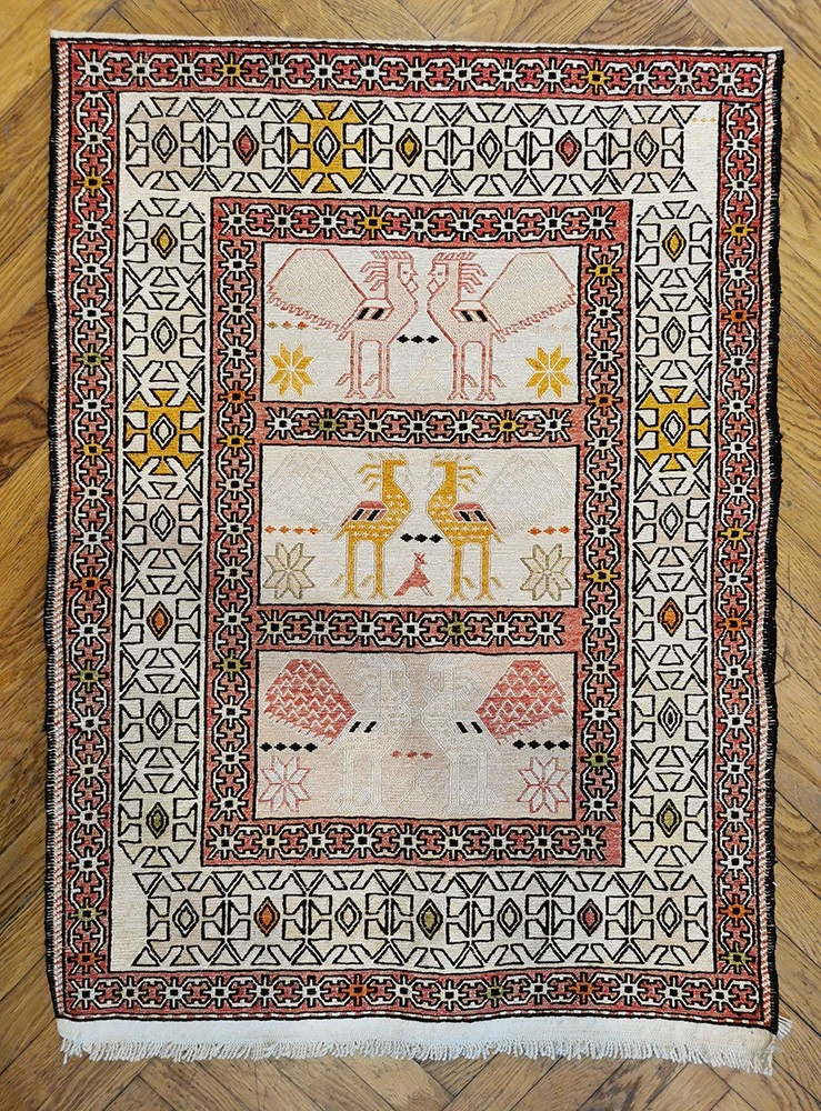 Aufgrund von Stil und Verarbeitung stammt dieser Kelim wahrscheinlich aus dem nördlichen Aserbaidschan, möglicherweise aus Regionen wie Sheki, Quba oder Lahidsch, die für ihre Soumak-Gewebe aus Seide bekannt sind. Solche Kelims wurden historisch oft als Prestigeobjekte gefertigt, die für besondere Anlässe, Hochzeiten oder als Teil einer Mitgift verwendet wurden. Dies ist nicht nur ein dekorativer Gegenstand, sondern Träger von Symbolik, Geschichte und Identität, die für den kaukasischen Kulturraum charakteristisch sind.