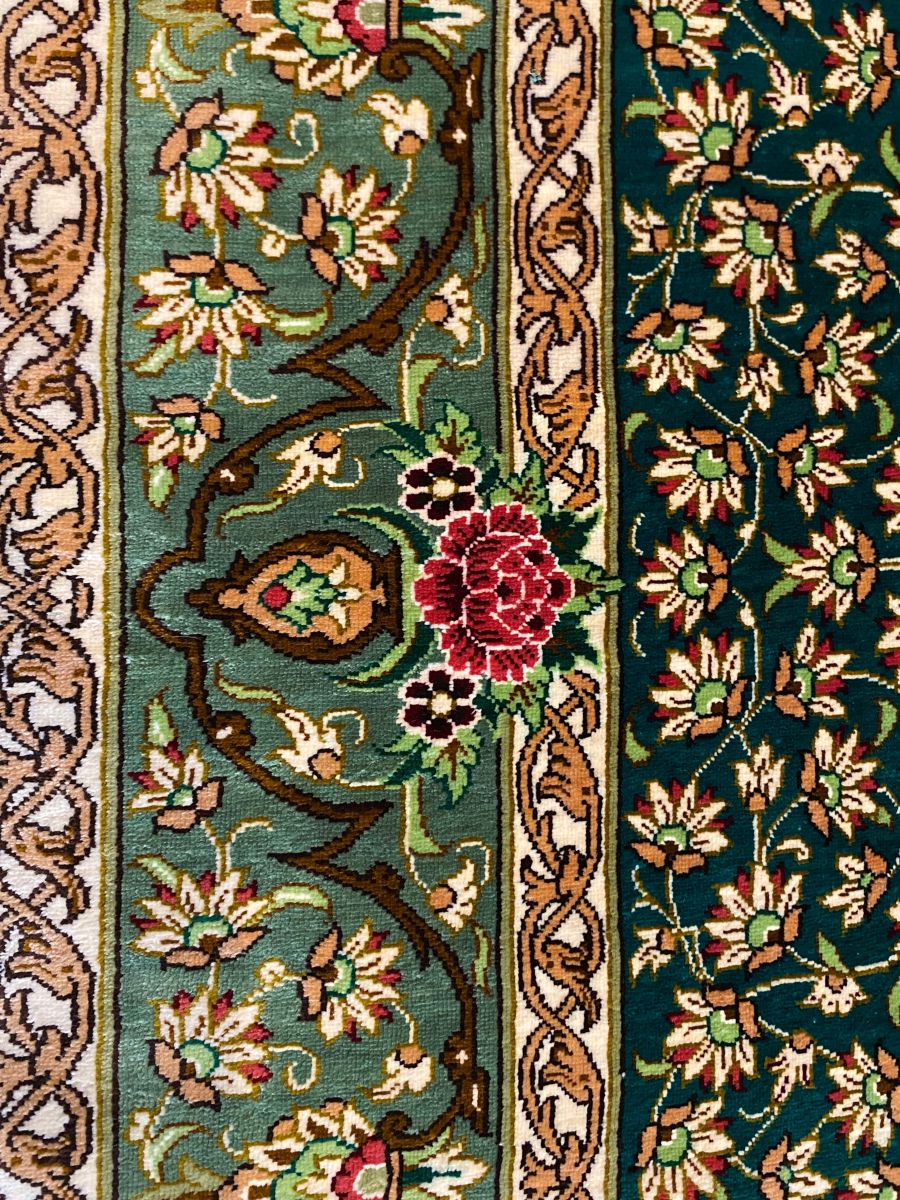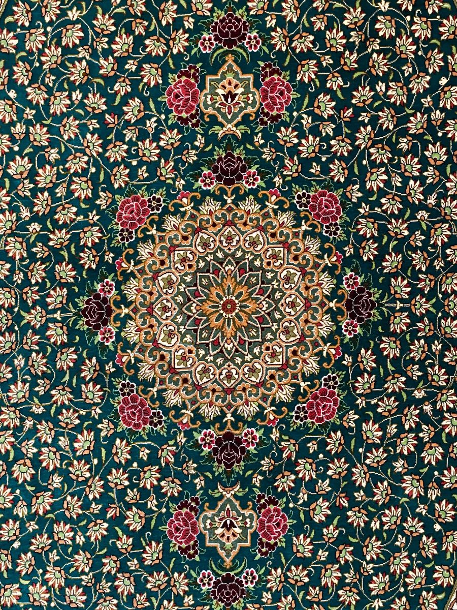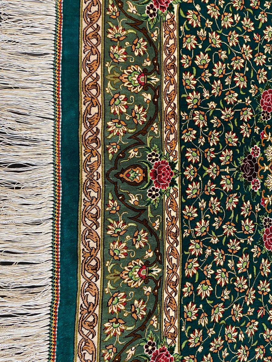 Um das Medaillon herum sind Shah-Abbasi-Motive verflochten – stilisierte Lotus- und Lilienblüten, die in der persischen Ikonografie für Reinheit, Fruchtbarkeit und Edelmut stehen. Diese Blüten sind durch geschwungene Islimi-Ranken (Arabesken) verbunden, die die ewige Bewegung der Natur und den ununterbrochenen Fluss des Lebens veranschaulichen. Rosafarbene Akzente in Form von Pfingstrosen ergänzen die Symbolik von Reichtum und Ehre, während kleine, fein geknüpfte Blättchen in Goldtönen auf das Licht und die göttliche Präsenz hindeuten, die den auf der Seidenoberfläche dargestellten Paradiesgarten durchdringt. Die gesamte Komposition dient somit nicht nur der Dekoration, sondern erzählt eine Geschichte der Harmonie zwischen Erde und Himmel.