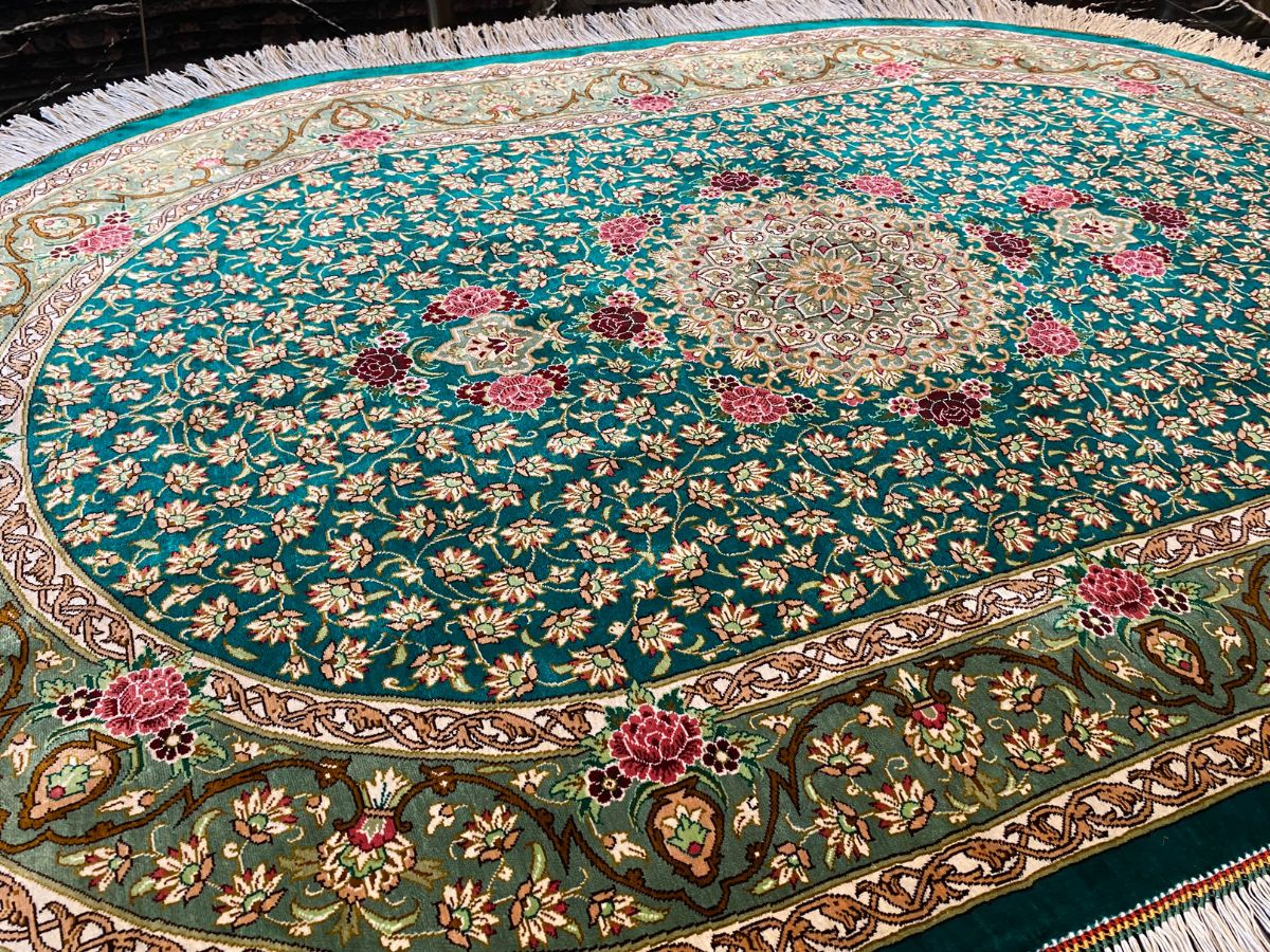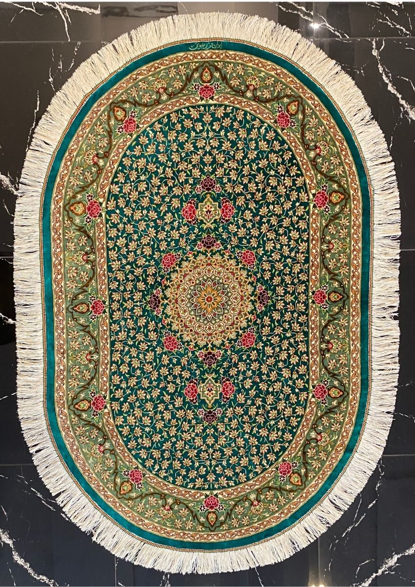 Dieser außergewöhnliche Perserteppich aus Ghom stellt den Gipfel der Textilkunst dar, da er vollständig von Hand aus edelster Naturseide gefertigt wurde. Seine Ästhetik basiert auf einem tiefen Smaragdgrün, das in der persischen Tradition Wohlstand, Natur und Ewigkeit symbolisiert und zugleich einen dramatischen Kontrast zu den reich verzierten floralen Motiven in Gold- und Rosétönen bildet. Die ovale Form ist technisch äußerst anspruchsvoll, da sie vom Knüpfer eine perfekte Anpassung des Musters an die Kurven verlangt. Dies unterstreicht die meisterhafte Komposition, bei der das zentrale Medaillon als Fokus fungiert, von dem aus sich feine Arabesken-Details harmonisch ausbreiten. Der Wert des Teppichs wird zudem durch eine handgewebte Signatur-Kartusche am oberen Rand bestätigt, die seine Authentizität und prestigeträchtige Herkunft garantiert. Dank der hohen Seidenknotendichte verändern sich die Farben im Spiel des Lichts ständig, was dem Stück eine Lebendigkeit und Tiefe verleiht, die nur wertvollste Unikate besitzen. Ein solches Kunstwerk ist nicht nur ein exquisites Dekorelement, sondern eine dauerhafte Investition, die jahrhundertealte Tradition mit dem raffinierten Luxus moderner Interieurs verbindet.