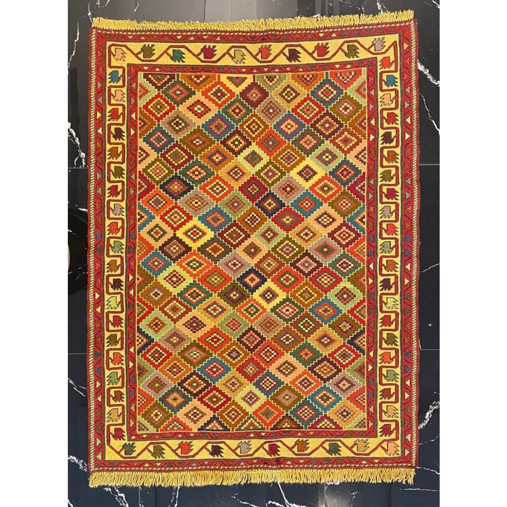 For millennia, rugs have been faithful, time-tested companions to nomadic peoples—used to cover floors, in place of furniture, as decoration, as a horse saddle cover, for sleeping, as a travel tent, for meditation, as a shroud for the final farewell from this world… Special rugs are made for healing and wedding rituals. Rugs are rich in symbolism; they enable communication across time and space, with messages expressed through various compositional structures, colors, and the figures within them. The Azeri, who have lived in northern Iran and Azerbaijan for centuries and millennia, have been making rugs in an original, unchanged way. The weaving technique and traditional patterns are passed down from generation to generation, but the rug’s final look depends most on the maker’s personal touch. Mothers teach daughters how to spin and work with wool, while fathers pass on to sons the knowledge of dyeing wool and making looms. The motifs they depict are drawn from their surroundings, local tradition, and their lives. Thus, in these rugs you can find everything from stars to archaic Mesopotamian forms. The characteristic stylized figures (stepped diamond and stars) lend this Azeri kilim a special playfulness. Under skilled fingers, beautiful combinations have emerged using plant-based earthy dyes and archaic patterns.