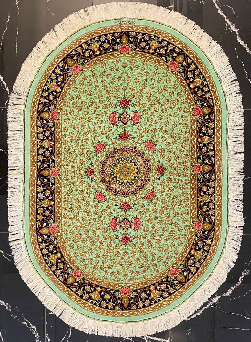 Forme ovale : Les tapis ovales sont beaucoup plus complexes à réaliser que les rectangulaires dans le monde du nouage à la main. Ils exigent une planification magistrale du motif pour que le dessin s’adapte naturellement aux bords arrondis sans perdre sa symétrie.