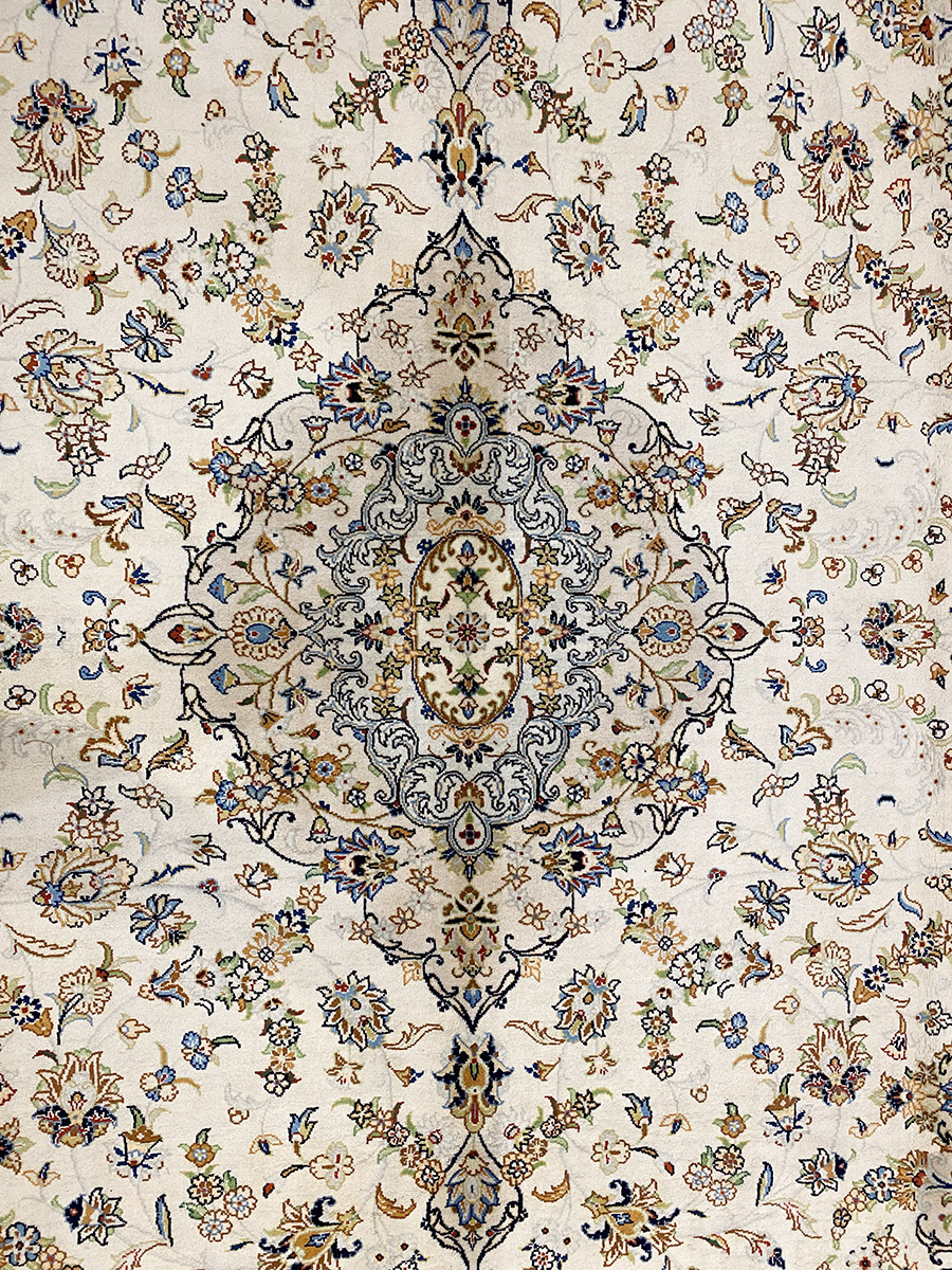Estetika preproge Kashan temelji na uravnoteženosti in harmoniji – prepoznavna je po osrednjem medaljonu z razkošnimi cvetličnimi ornamenti, ki se razlivajo čez celotno površino v obliki vinjet, listov in arabesk. Vzorci so izredno detajlirani in izdelani z visoko natančnostjo, kar preprogi daje občutek nežnosti in plemenitosti.