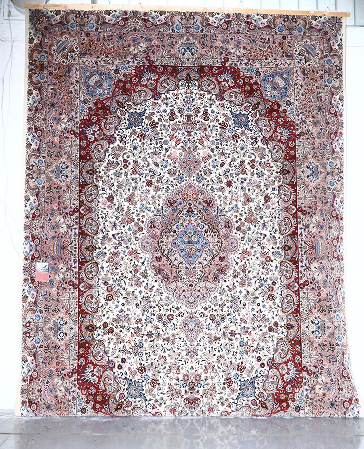 Vzorci preproge pripovedujejo zgodbo tradicije in simbolike – vsak cvet in ovinek ima svoj pomen, prepleten v natančnem, ročno vozlanem tkanju, ki s svilenimi poudarki ustvarja mehak lesk in subtilno globino. Kljub bogastvu ornamentike preproga ne deluje prenatrpano, temveč uravnoteženo in estetsko popolno.