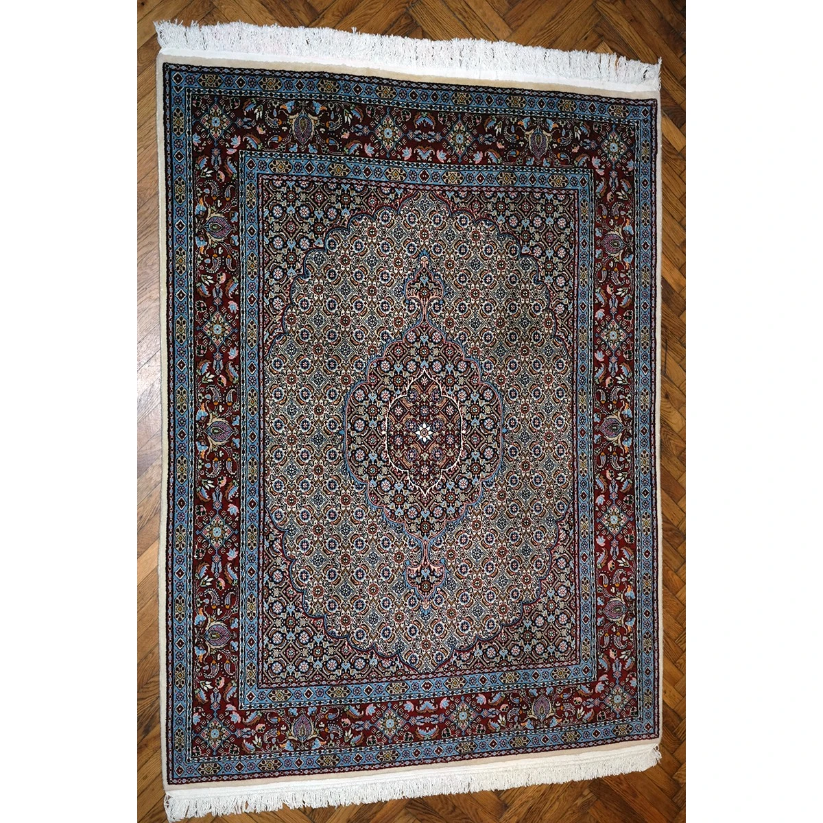 Perzijska preproga tipa Moud, ki izvira iz območja Moud, združuje bogato ornamentalno tradicijo z izredno rafinirano kompozicijo. Njena estetika temelji na harmoničnem ravnotežju med geometrijo in cvetličnimi motivi. V središču preproge je izrazit medaljon, ki deluje kot vizualno jedro kompozicije in spominja na arhitekturne kupole ali dekorativne elemente perzijskih palač in mošej. Okoli njega se razprostira gosto tkano polje z drobnim ponavljajočim se Herati oziroma Mahi vzorcem, v katerem majhni rombi, cvetovi in stilizirani listi ustvarjajo občutek ritmičnega gibanja in skoraj neskončnega ornamentalnega vrta. Ta vzorec ima dolgo tradicijo v perzijski umetnosti in simbolno povezuje idejo naravne plodnosti, vode in življenjskega cikla.