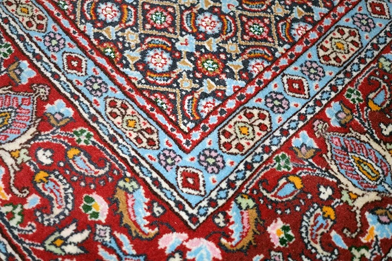 Ta preproga je zelo lep primer klasičnega perzijskega dizajna Moud, pogosto tkanega iz volne z detajli iz svile. Moud preproge izvirajo iz območja Moud in so znane po izredno finem, geometrično-cvetličnem vzorcu ter svetlejši barvni harmoniji.