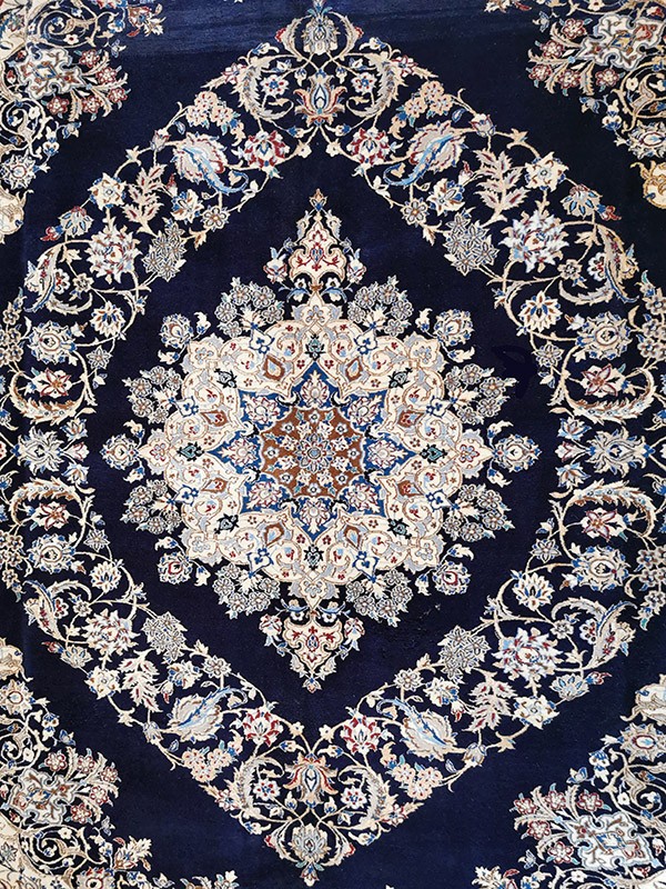 Estetika te preproge temelji na klasični medaljonski kompoziciji, s čudovitim osrednjim rozetam v obliki snežinke ali cvetlice, umeščene v temno modro (navi) romboidno polje. To kontrastno temno modro ozadje dramatično poudari fine svilene vzorce, ki vključujejo stilizirane cvetlice, listne girlande in arabeske, vse v svetlejših tonih – slonokoščena, bež, nežno modra in svetlo siva.