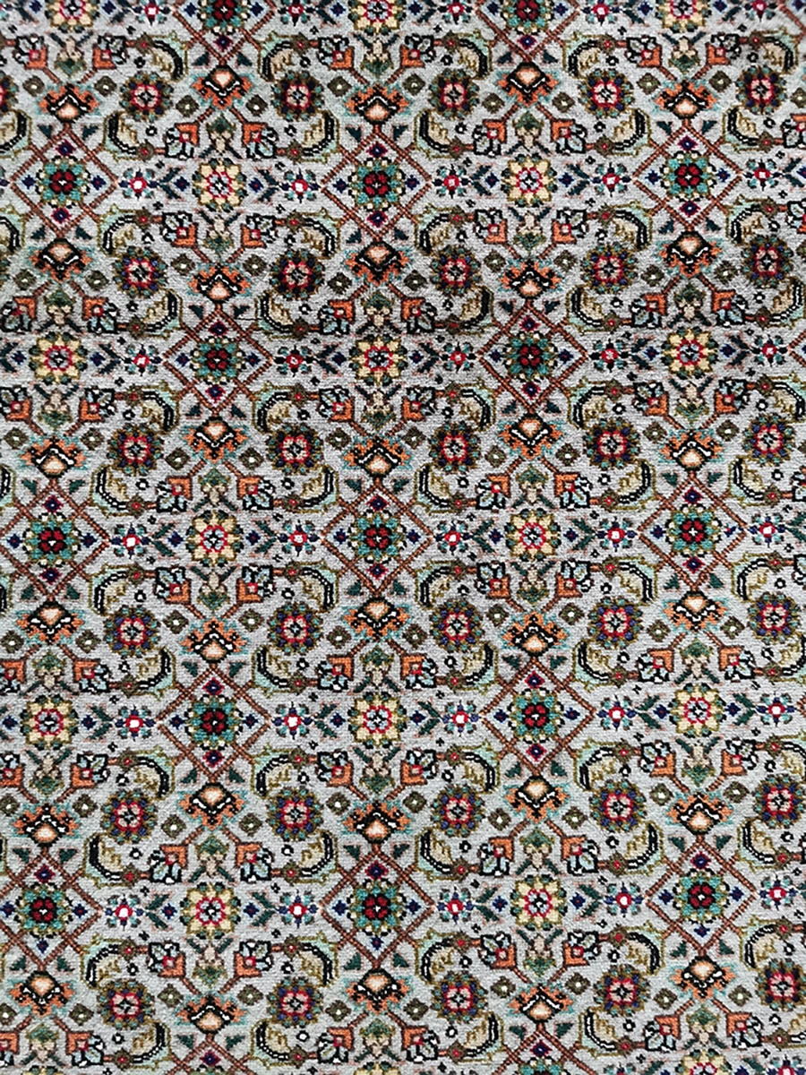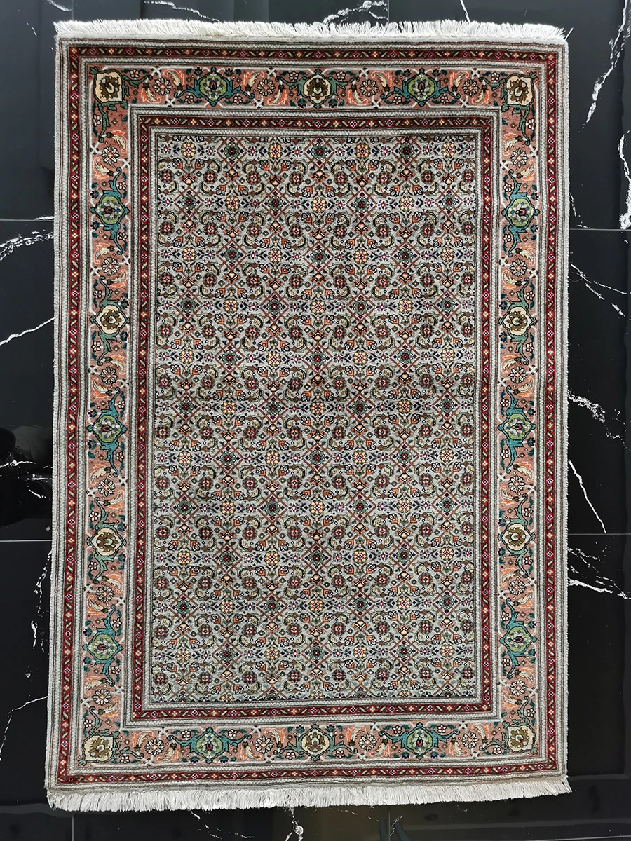 Ta perzijska preproga iz Tabriza je ročno vozlana iz volne in svile, kar ji daje izjemno mehkobo, sijaj in dolgo življenjsko dobo. Preproga ima značilen vzorec obdanim z arabeskami in cvetličnimi motivi, pogosto z vtisi vitic ali cipres. Barvna paleta je nežna, z rastlinskimi pigmenti pobarvanimi odtenki, ki prostoru dodajo brezčasno eleganco in občutek topline. Volna zagotavlja trpežnost in mehkobo, svila pa subtilen lesk in bogatost podrobnosti, ki se ob gledanju spreminja glede na kot svetlobe. Preproga zaradi visoke gostote vozlov in preciznega ročnega tkanja ponuja izjemno detajliran dekorativni vzorec, ki je hkrati klasičen in izjemno estetsko dovršen. Umestitev takšne preproge v prostor poudari njegov prestiž in toplino, zato je primerna za elegantne bivalne ali družabne prostore, kjer postane osrednji umetniški poudarek. Njena estetika in kakovost dajeta prostoru brezčasno lepoto in vizualno bogastvo, ki pritegne poglede in hkrati izraža kulturno tradicijo izdelave najbolj finih perzijskih preprog.
