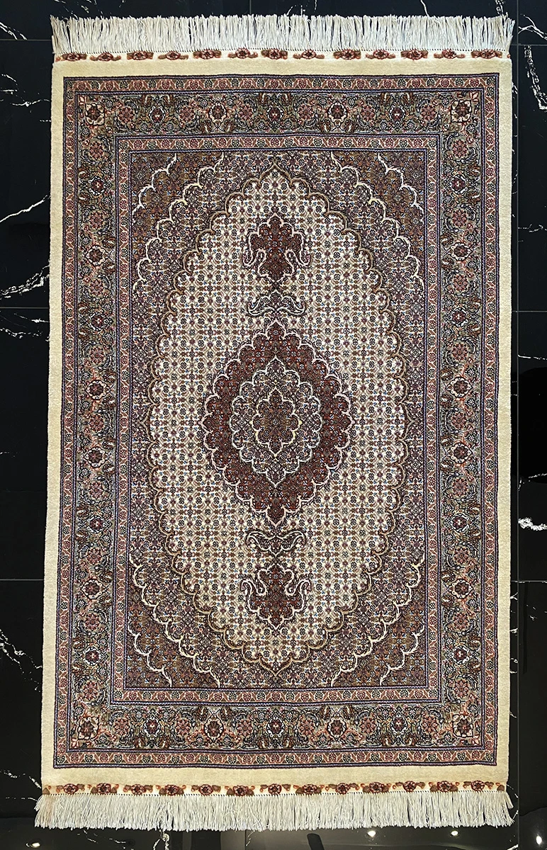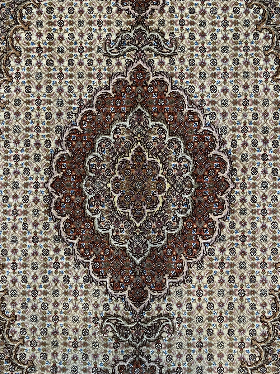 Estetika te fine perzijske preproge tipa Tabriz deluje kot vizualna poezija, kjer se tradicija, simetrija in izjemna natančnost zlijejo v harmonično celoto. Že na prvi pogled prevladuje klasična kompozicija z osrednjim medaljonom, ki deluje kot srce celotnega dizajna, okoli njega pa se plastijo bogati ornamentalni vzorci, skoraj kot valovi, ki se širijo navzven. Takšna zasnova je značilna za preproge iz Tabriza, kjer so centralni medaljoni in natančno uravnoteženi robovi ključni elementi estetske identitete