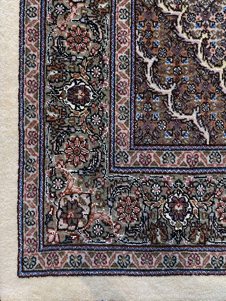 Barvna paleta deluje toplo in plemenito, z dominacijo kremnih, rdečkasto-rjavih in temnejših poudarkov, ki ustvarjajo občutek globine in starinske elegance. Volna daje površini mehko, žametno osnovo, medtem ko svileni detajli subtilno lovijo svetlobo in ustvarjajo rahel lesk, zaradi katerega se vzorec skoraj premika glede na kot pogleda. Ta kombinacija materialov je tipična za fine Tabriz preproge in prispeva k občutku razkošja in taktilne prefinjenosti
